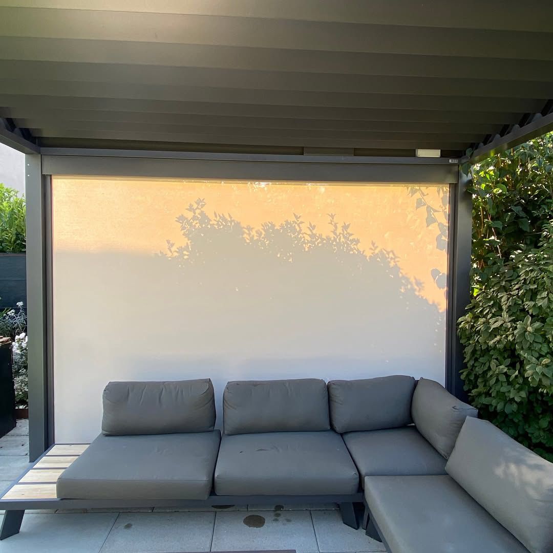 Effektiver Hitzeschutz ohne klobige Rollladen-Optik. Maßgefertigt, elektrisch steuerbar und langlebig.